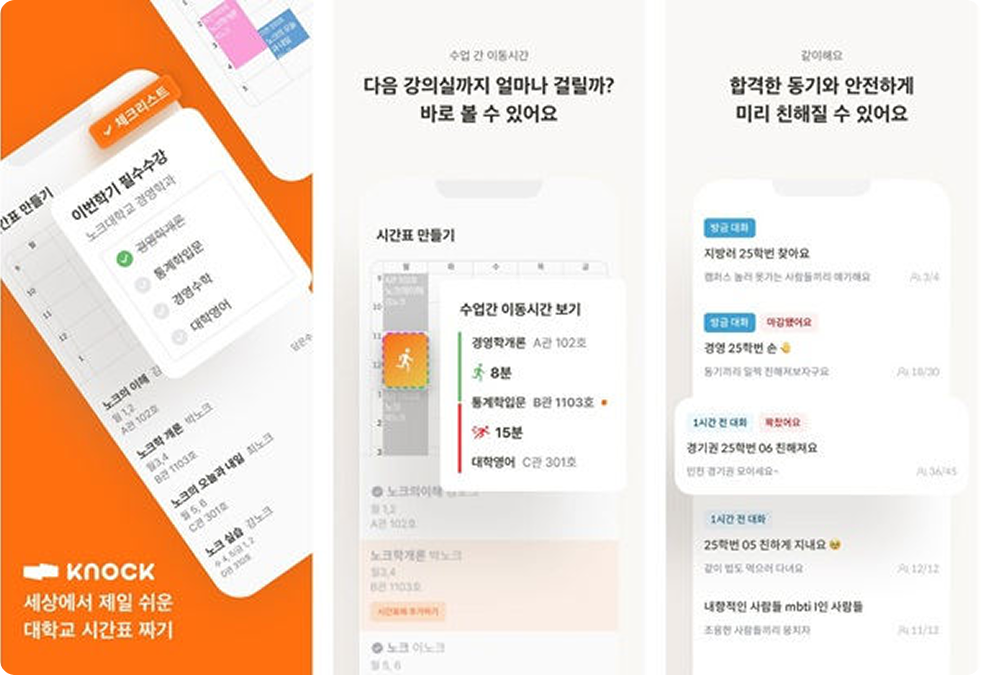 “생활밀착형 서비스 노크는 대학생이 캠퍼스 생활에서 겪는 다양한 불편함을 노크에서 안전하게 해결하도록 돕는 AI기반 커뮤니티 서비스다. 시간표 관리, 강의 정보 공유 및 교환, 대학생 간 소셜링 등 대학 생활 전반의 니즈를 충족시키고 있다. ”